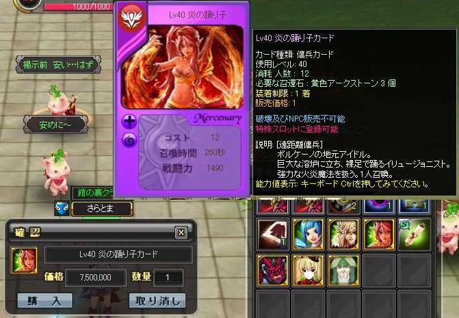 露店で7.5Mです。 Lv20→Lv40までの育成で虹色換算4M程度は掛かります。 ですから実質3.5Mとか。 ちょうどカブトに同行させる召喚雑魚殲滅傭兵が欲しい所だったので、買いたかったのも事実。 ただ市場評価が低いコトから、イラナイ子化してしまう可能性もあり>< だめなら売っちゃえばおk!ってコトで><b