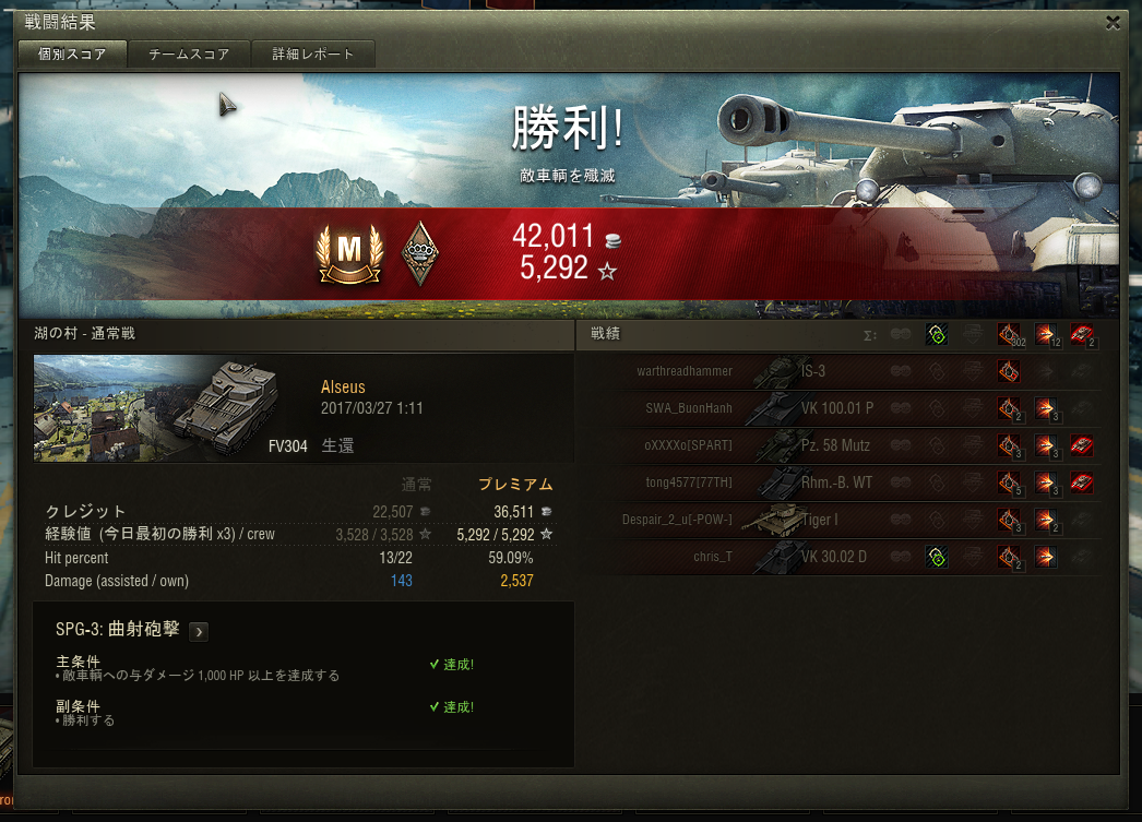 ちな、ミッションで使ったFV304が初のAceTankerを取りました!