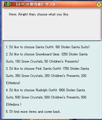 ↑これは1番のエリアで拾う事の出来るサンタ石を80個あつめて表示される内容です。 上から順に、サンタセット(たぶん赤サンタ)、スノボギア(これはなんでしょ?w)、桃サンタセット、ルドルフセットになるみたいです。 即ち!黒サンタセットはここでの交換じゃないみたい? ;;