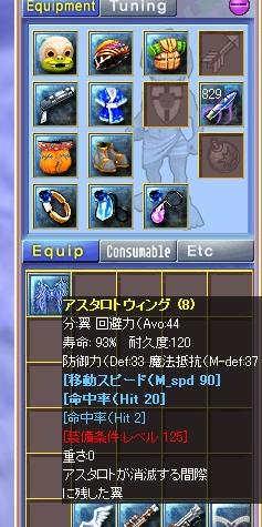 最近よく露店を巡回しています。ヘブンズの良品が出ていないかなぁって、その確認なんですが…アス羽発見!! 精錬(5)で耐久110回避40補正Hit2汗 値段は70M。 ちょっと高いし、本当なら金アス羽の方が欲しいとか思っていたので悩んだのですが…たぶんここで買わないと次のチャンスがいつになるか分からない…。 そんな訳で購入しちゃいました^-^w まぁ宝石7が1個分だと思えば(ぇw まだ精錬(5)と完成していないので早速精錬ですよ! 粉は…全部Crで><b 6→7→8とストレートです。 下手にNa使って失敗しても嫌だし、なにより耐久110の回避40なのでこれをUPさせたいかな?と贅沢にCr使いました。 貴重なCrの在庫は減ったけど、その甲斐があって…