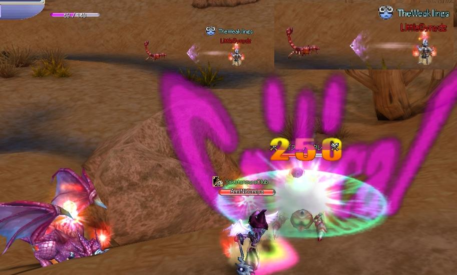 最初はこの人、この距離だったんですよ。まぁこっちの狩りに支障はないし…って見逃していたら、調子のってか知らないですが、私の真横にいる敵にまで手を出す始末。タイミングを見計らって"横された”事を合図にぬっころし!私悪くない><b とりあえず仕返しに来るだろうと召喚のゴン君を2匹にしてフルサポ…準備OK!