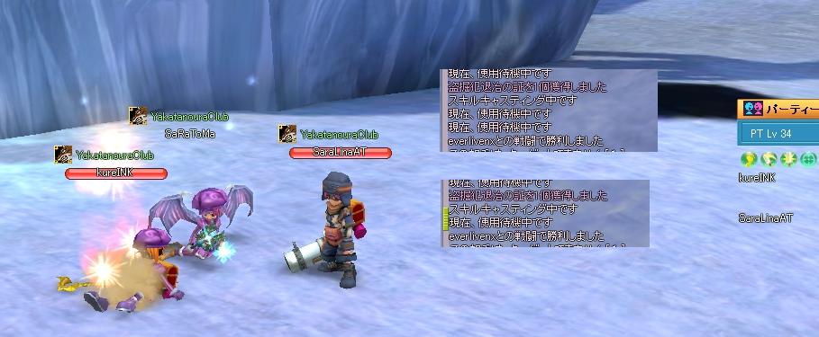今回りなさんみつさんといっしょにイエティ周辺いってきました。3人いるからかコンビネーションがよいからかライダーまで良い感じで狩る事が出来ました♪このままLv100までは楽に育てられそうです^-^w Lv95ぐらいから亡者の砂漠で毒サソリかな。粉のドロップがどこまで制限されているか分かりませんがとりあえず経験値は美味しいので楽しみにしています♪