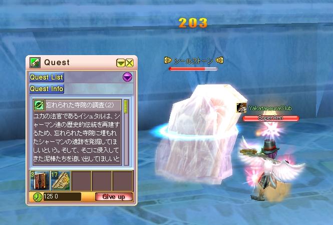 やはり狩場枯渇であえいでいます;; マウルテーブルの狩りが出来るようにはなっていたのですがイマイチ美味しくないと言うか液が少ないと言うか…。ほんとマジ乙です・・・汗 そんな感じですぐ飽きてしまうので今回は寺院クエに挑戦してみました。 魅力装備は揃っていないのだけど経験値稼ぎも兼ねてでいいかな?って。 B2大部屋では囲まれると簡単にしねますwさすがミュズ防御って感じですね。大部屋もはじっこから1匹ずつ倒していって石の周囲に敵がいなくなってから石を叩く。ちょっと効率悪いけどssにあるように1時間足らずでクエ終了しているので美味しいと言えば美味しいのかな^^; あ、液は殆ど拾えていないんだけどもw どっちにしても早くLv130へ完成させて、アティをLv160へ。そして放置してあるブルで資金を稼ぎつつトパ7を揃える!残り5つ欲しいので今の相場からすると…70M~90M x 5 = 350M~450M 必要です。ぜんぜん足りませんw