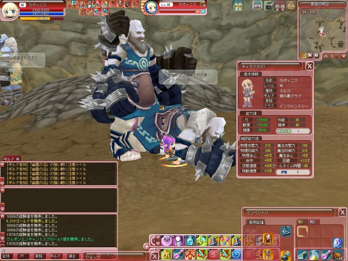 幽霊沼のMapでLv90↑の敵を相手に稼ぎつつ育てつつしてましたが、どうも妖精谷の方で1発した方がExp/Gold共に効率いい事が分かりまして…それでも妖精谷はエラー落ち+デスペナが付き纏うんですよね^^; これさえ無くなってくれればと・・・。